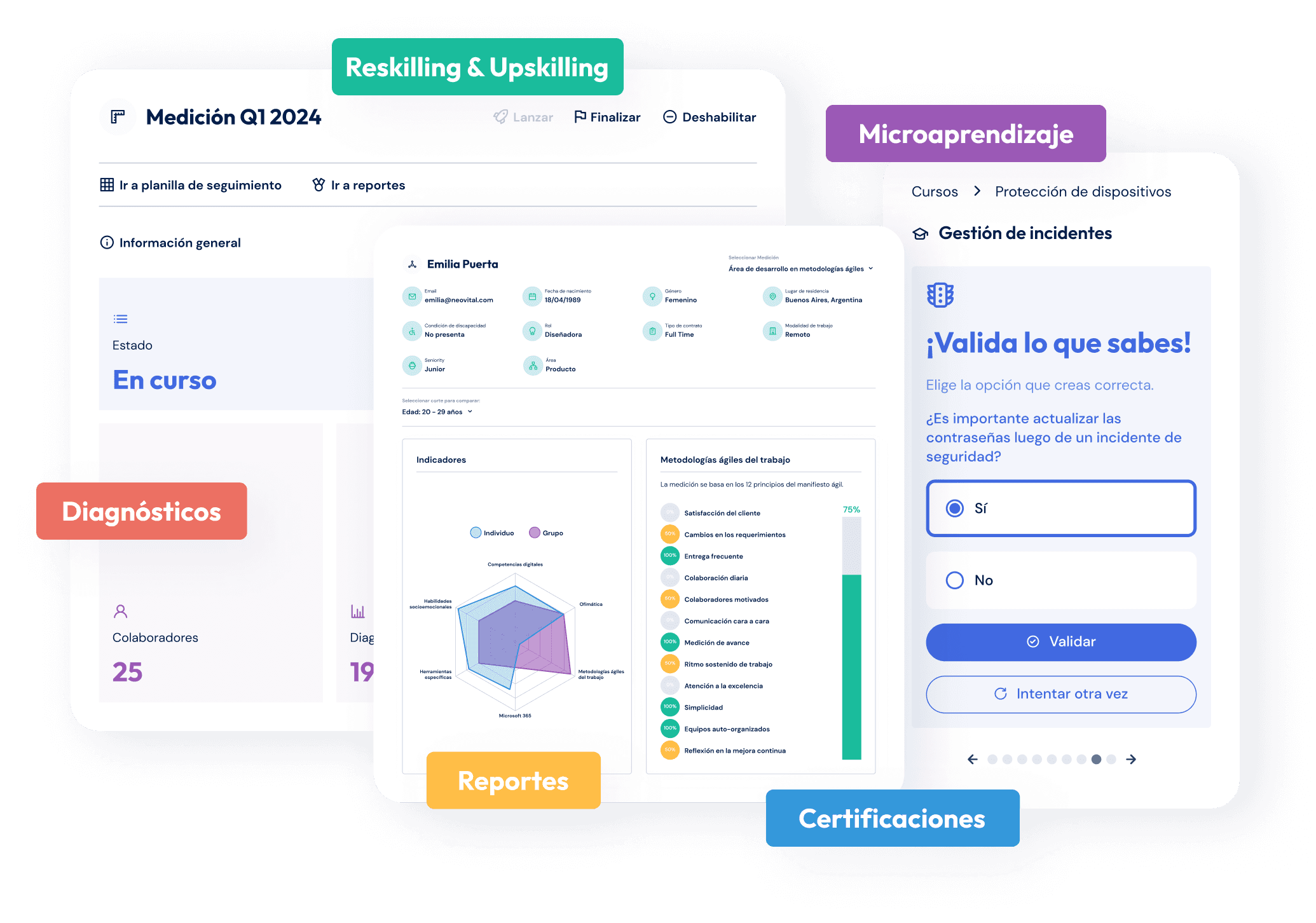 Diagnostica, capacita y certifica las habilidades técnicas y socioemocionales de tus equipos en una única plataforma de aprendizaje continuo impulsada con inteligencia artificial